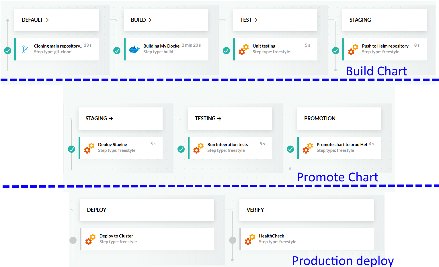 - Deployment of the Helm chart to a staging environment. After it is tested the chart is promoted to one or more “production” Helm repositories
