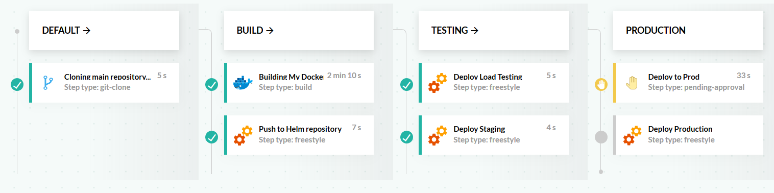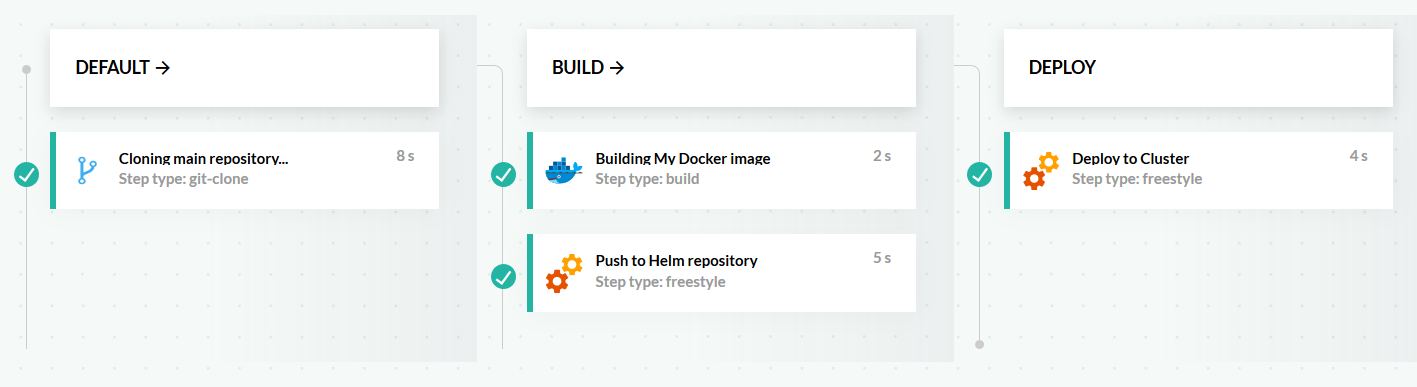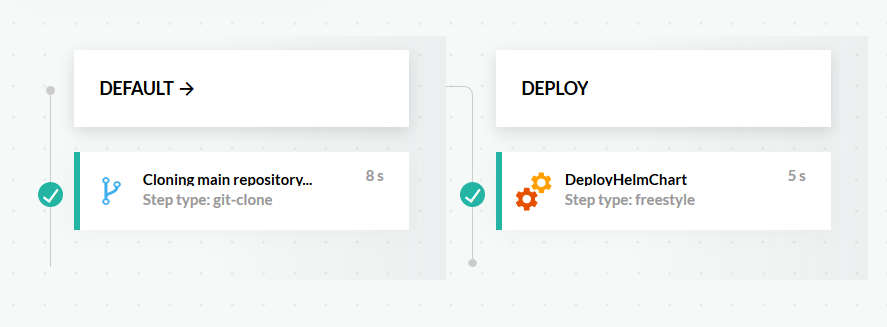 While this workflow is very flexible, it adds complexity on the number of Helm charts available (since they exist in multiple Helm repositories). You also need to set up the parameters between the different pipelines so that Helm charts to be deployed can be indeed found in the expected Helm repository.