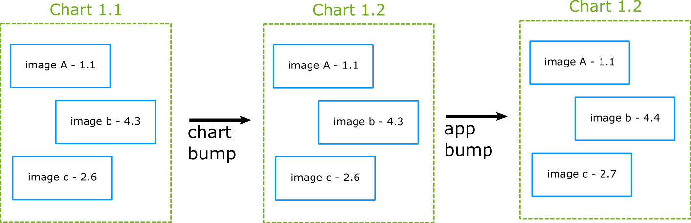 | App version | The version of the application contained in the chart. | Independent from chart version |