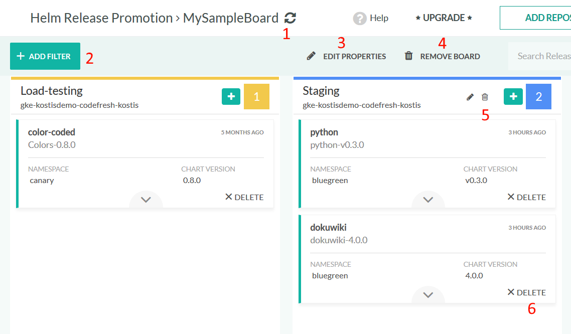 For each board, you define how many columns it will contain, where each column is a Helm-enabled Kubernetes cluster.