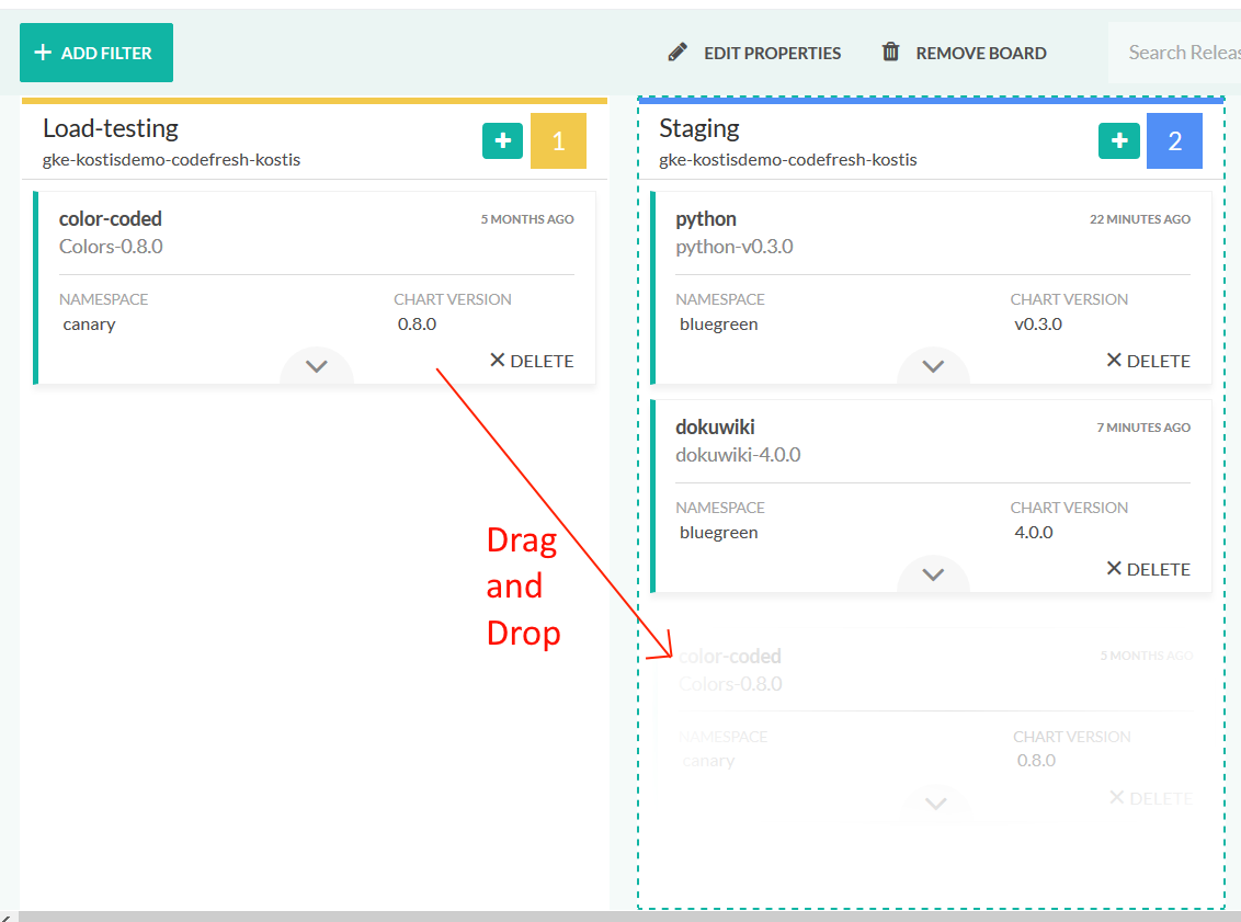 Once you have your columns in place, you can move Helm releases between clusters/namespaces by drag-n-drop. Each Helm release can be dragged to any other column either promoting it, for example, from QA to Production, or shifting it left, for example, from Production to QA.
