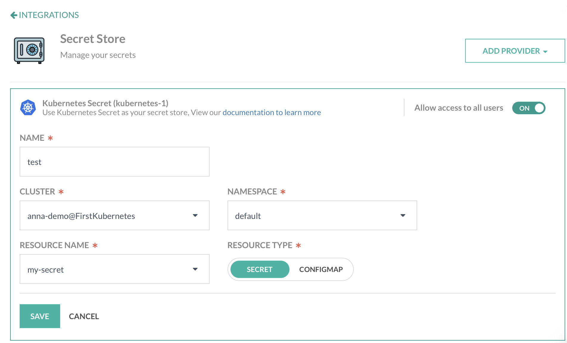 - To allow all users in the account access to the secret, enable Allow access to all users.