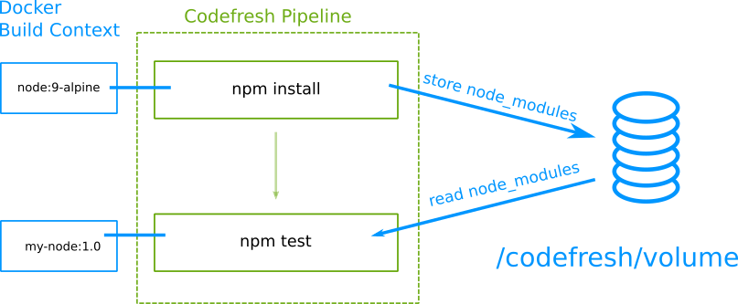 npm installand downloads all libraries innode_modulesinto the shared Codefresh volume. - The second step runs