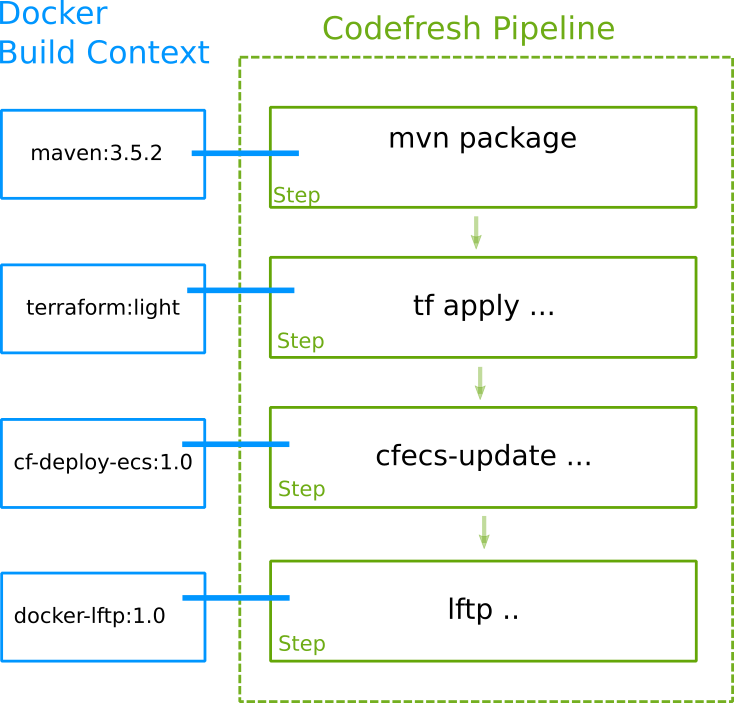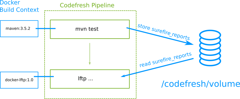 mvn testand produces some test reports intarget/surefire_reportsinto the shared Codefresh volume. - The next step uploads these reports using FTP to an external site.