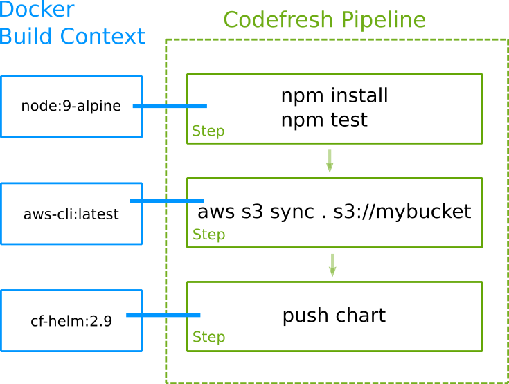 We have seen in the previous section that Codefresh can use Docker images as the context of a build step. The second important point to understand regarding Codefresh CI pipelines is that the default workspace of each step is shared between all steps in a pipeline.