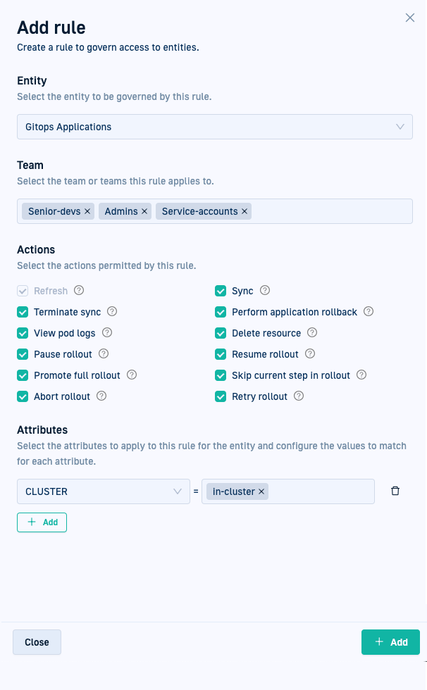 This rule grants the Support team permission to manually sync application entities or manually terminate on-going syncs for application entities deployed in a specific namespace, but only for those entities that share the same label.