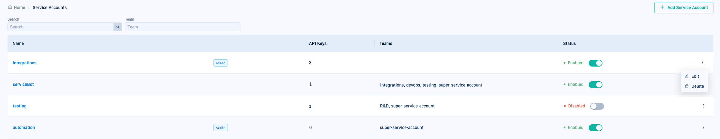 | API Keys | The number of API keys assigned to the service account. Selecting a service account displays the API keys generated for that account. Modify selected scopes by clicking Edit, or delete the API key. |
