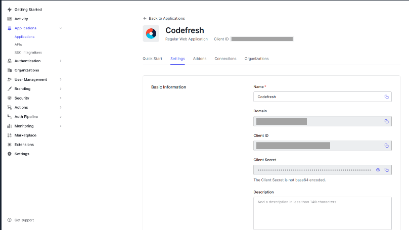 - Client secret: The Client Secret also generated for your Auth0 application.