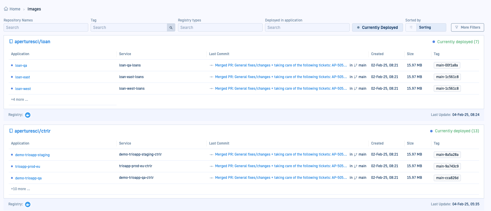 The dashboard offers a variety of filters to help quickly find relevant images. The default and most useful is the Currently Deployed filter, which pinpoints images actively deployed in applications with additional information on the tag, services, most recent commits and more.