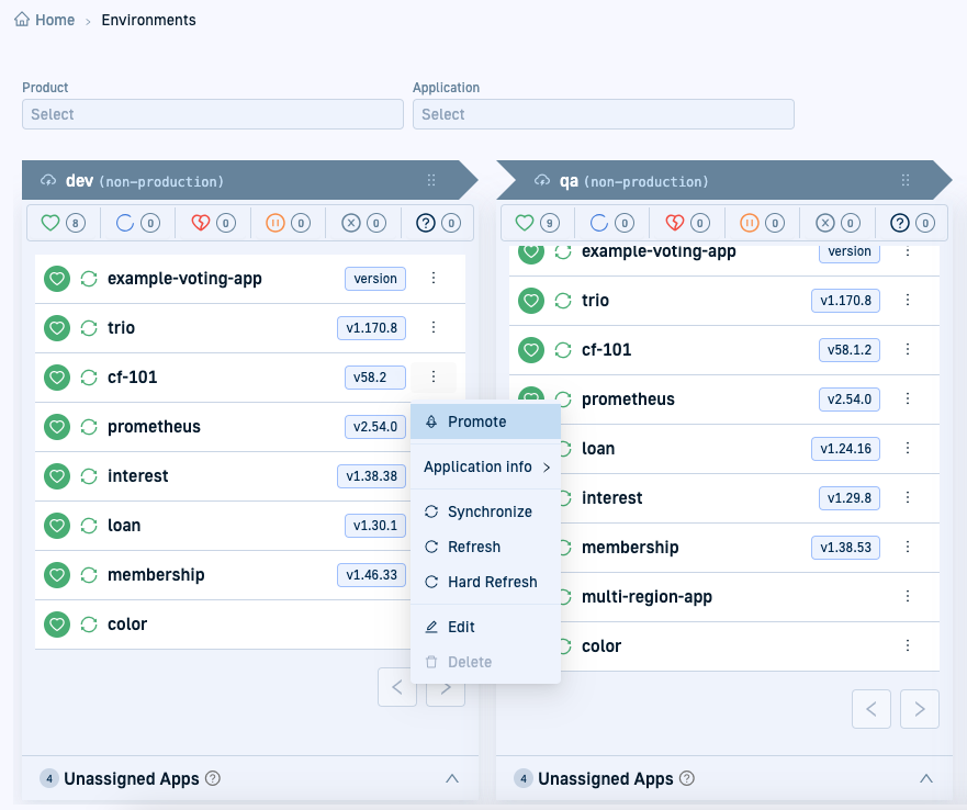 Promote a product or application from the Environments dashboard using one of two methods: