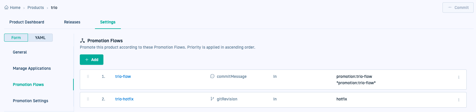 For example,update image tag to v1.1would be a valid commit message. - Defining the priority for each Flow when multiple Flows are configured