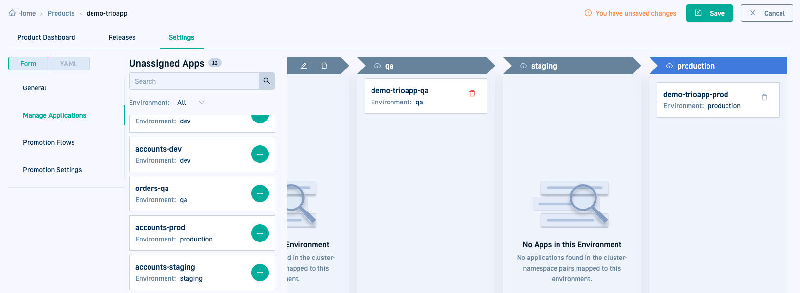 Quickly assign applications through the UI without modifying manifests. This method does not require a commit and is recommended for testing.