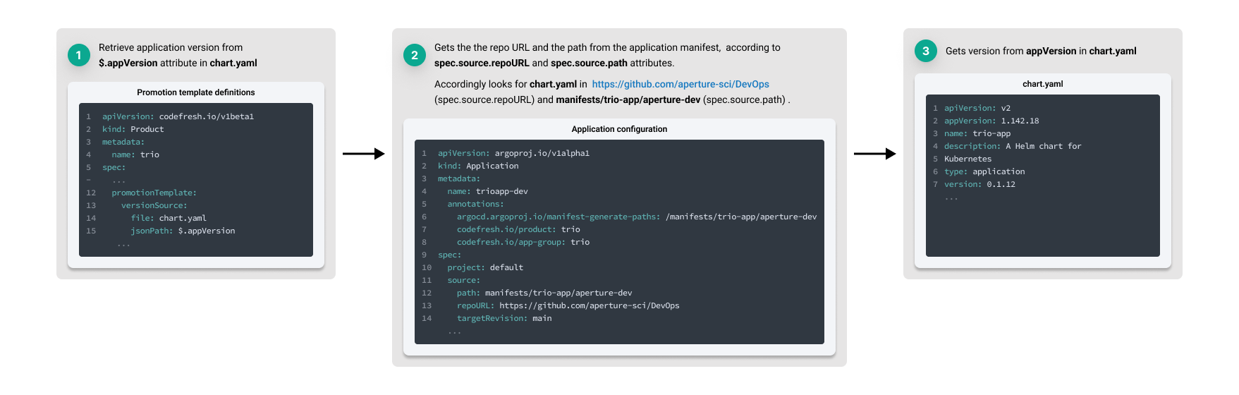 The Version attribute is defined using a JSON path expression. It is relative to the spec.source.repoURL and spec.source.path attributes defined in the source application’s configuration manifest.