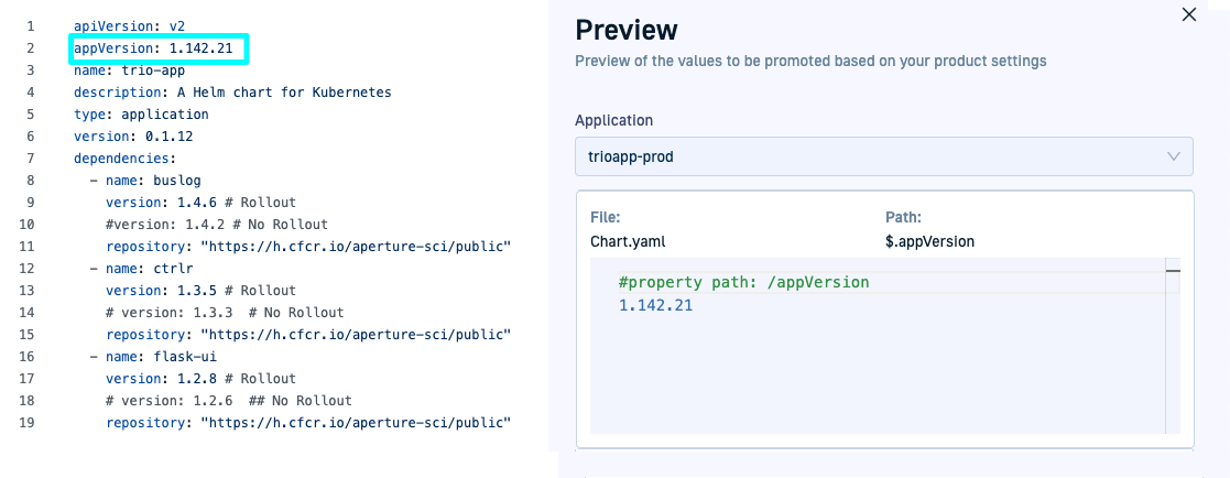 You can see that properties are configured to be promoted from three different files, with values.yaml containing multiple properties to promote.