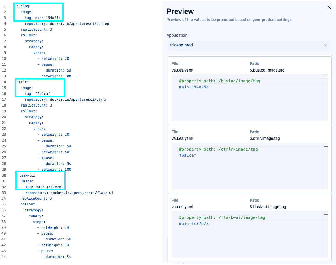 On the left, you can see the YAML manifests, on the right, the previews show how the trio-prod application resolves these values.
