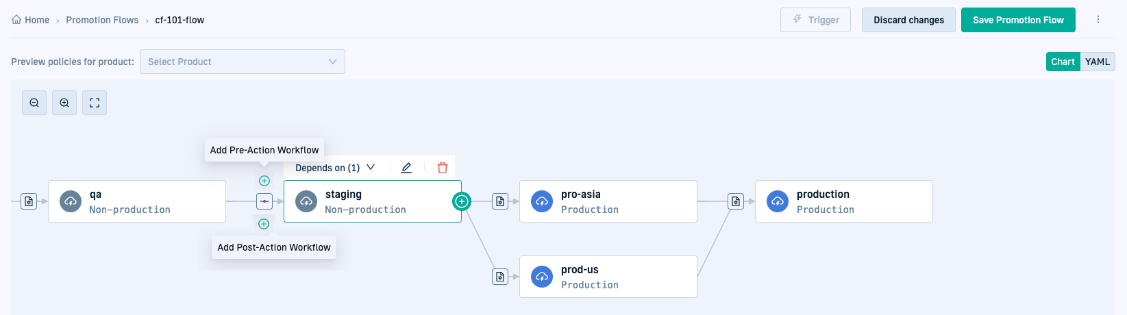 Visually design and create the flow by selecting environments, Promotion Actions, and Workflows, and defining dependencies through the Flow Builder. If needed, create new environments and promotion workflows on-the-fly when doing so.