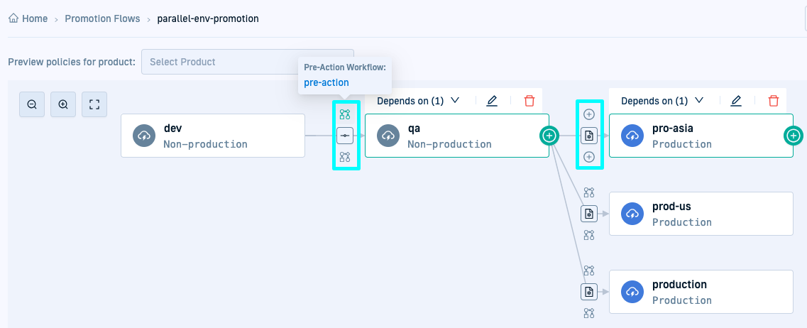 - From the list of Products, select the product for which to evaluate or apply Promotion Policy settings. The Promotion Action, Pre- and Post-Action Workflows that match are applied from the global Promotion Policies and displayed for each environment. Mouse over the Pre-Action, Post-Action, and Action icons to see the Workflows and the Promotion Action assigned.