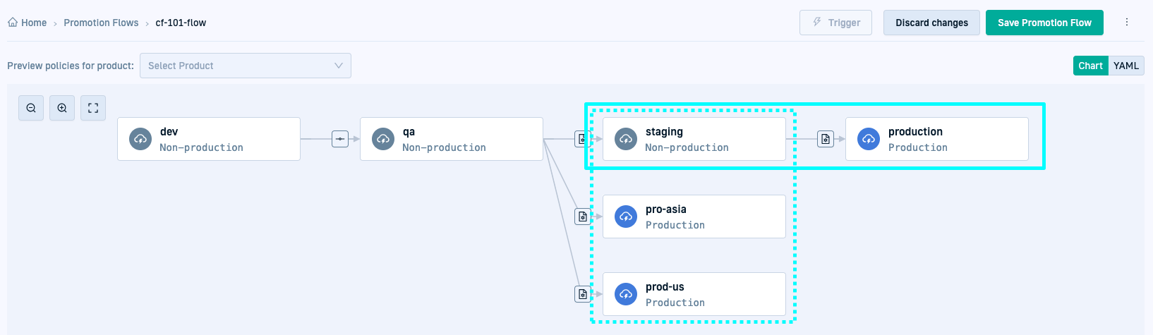 Promotion Flows start with a Trigger Environment, where the change to the application initiates the flow, and continue with one or more target environments where changes are promoted. You need at least one target environment in a Promotion Flow.