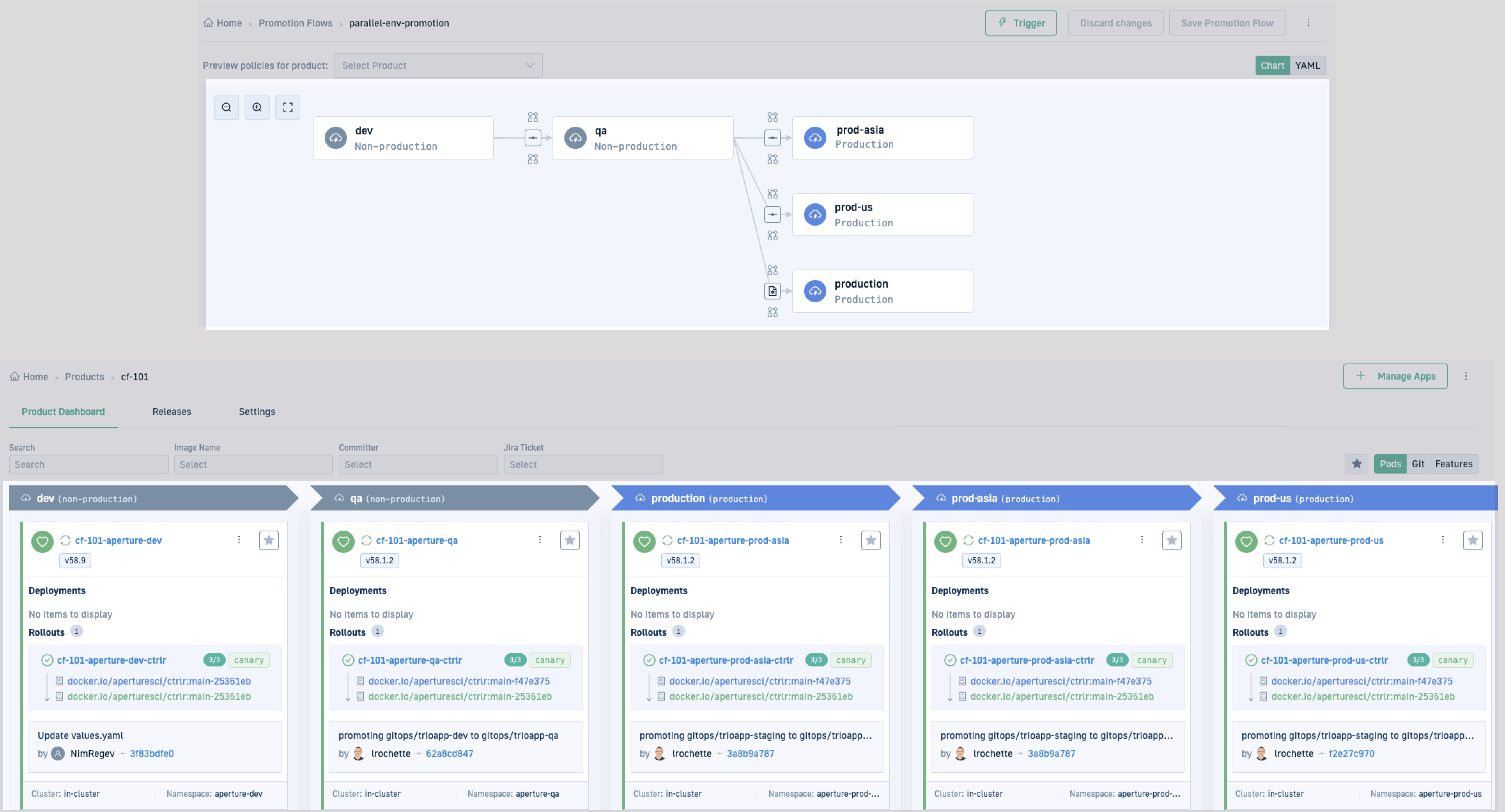 Simultaneously, promotions to prod-asia and prod-us occur independently (parallel).
