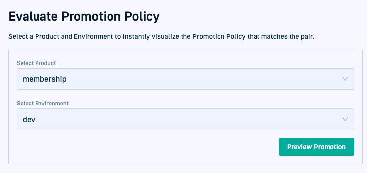 - Use the Evaluate Promotion Policy functionality to visualize policy settings for any product-environment pair. See Evaluate Promotion Settings for products and environments .