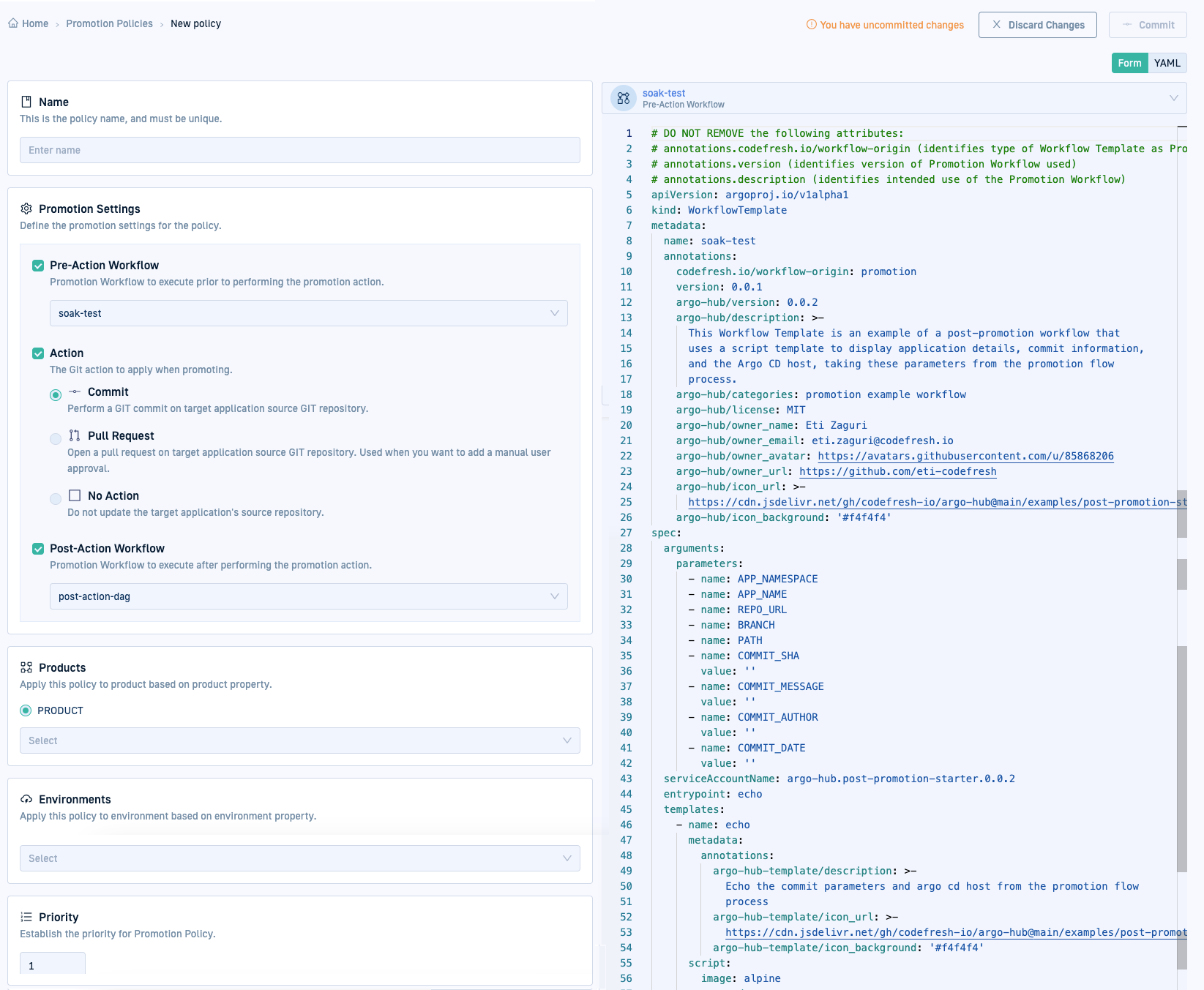 - Select the mode in which to define the Promotion Policy as YAML or Form.