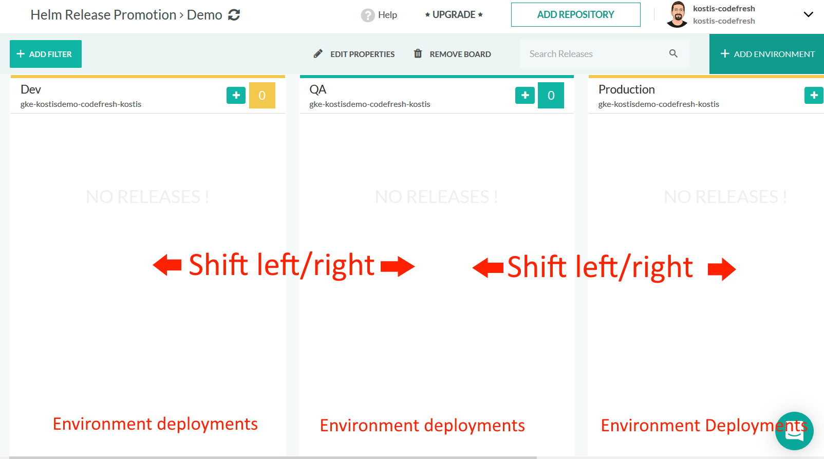 The environment board can function both as an overview of the whole lifecycle of the application, as well as a tool to shift-left/right Helm releases between environments.