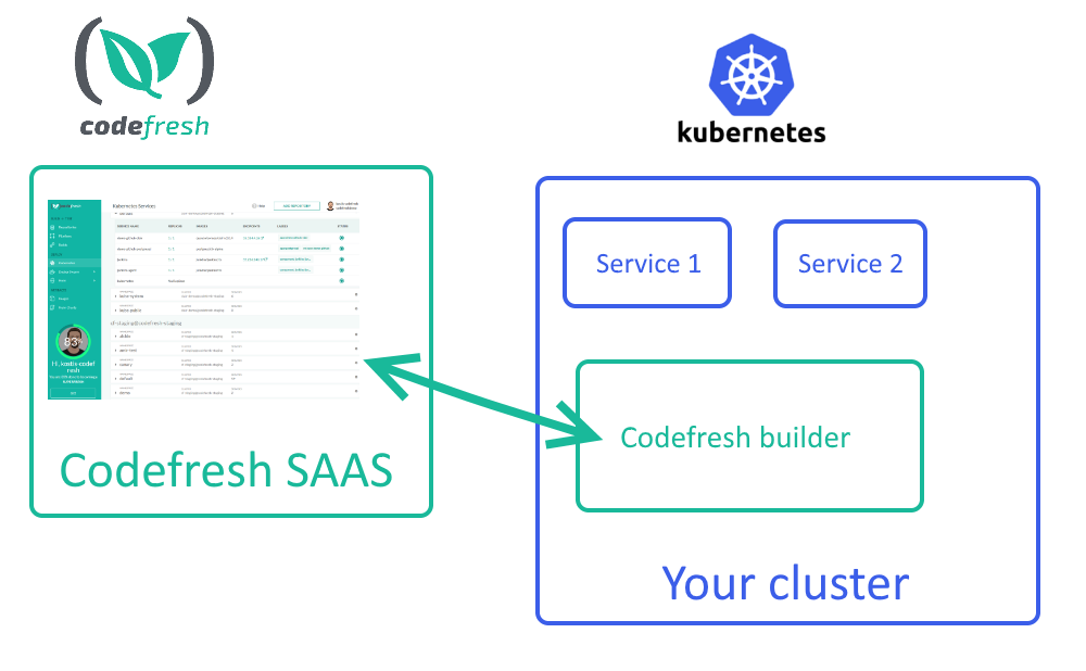 The UI runs on Codefresh infrastructure, while the builds happen on a Kubernetes cluster in the customer’s premises.