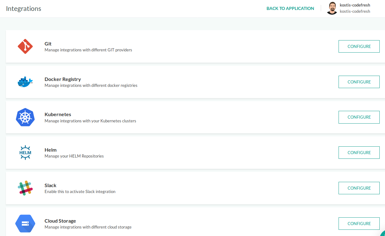 - In the Codefresh UI, on the toolbar, click the Settings icon, and then from Configuration in the sidebar, select Pipeline Integrations.