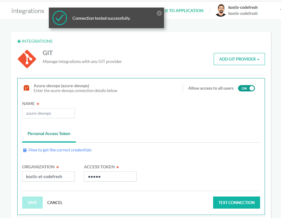 For each Git provider you need to set up authentication, for Codefresh to get access to the public and private repositories of the respective provider.