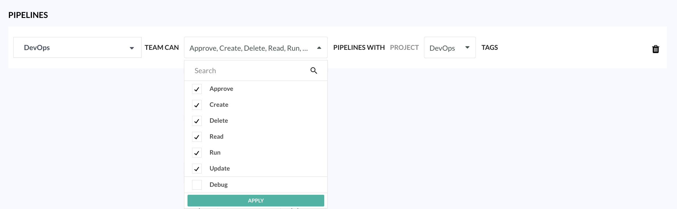 - Easily grant the same permissions to other teams for the same pipelines by creating Pipeline rules for the teams with the same project tags.