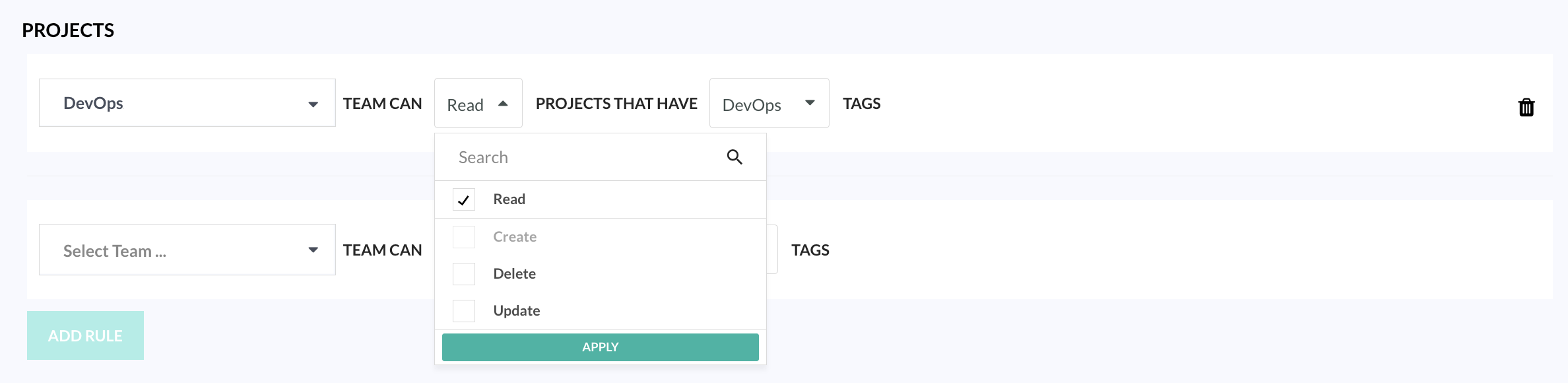 - Using the Project rule automatically created for the team to grants access to additional projects simply by assigning the same tag to the other projects.