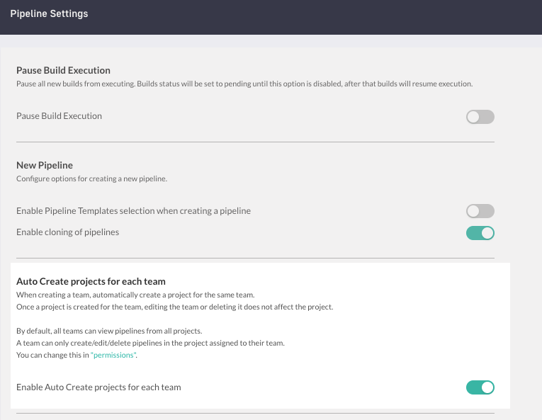 Enabled by default, auto-create projects for teams, automatically creates projects whenever you create teams in your account.