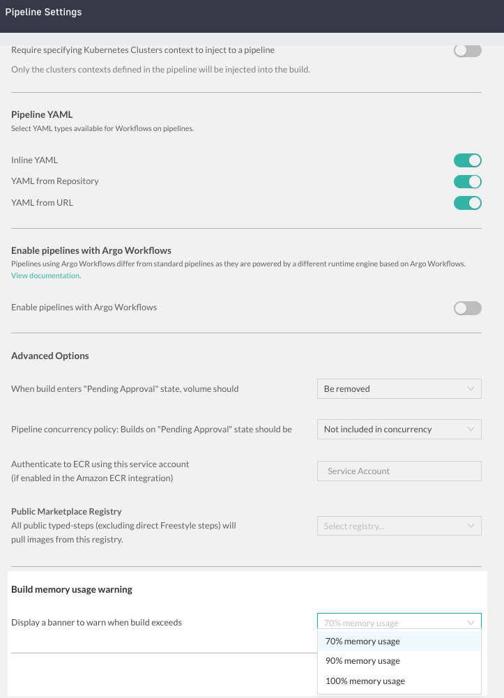 | Memory usage warning for pipeline builds | Enable alerts when pipelines reach/exceed the threshold. | |