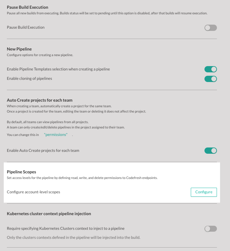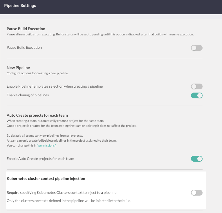 | Kubernetes cluster-contexts for pipelines | Define if users can select the clusters to which the pipeline has access. | |