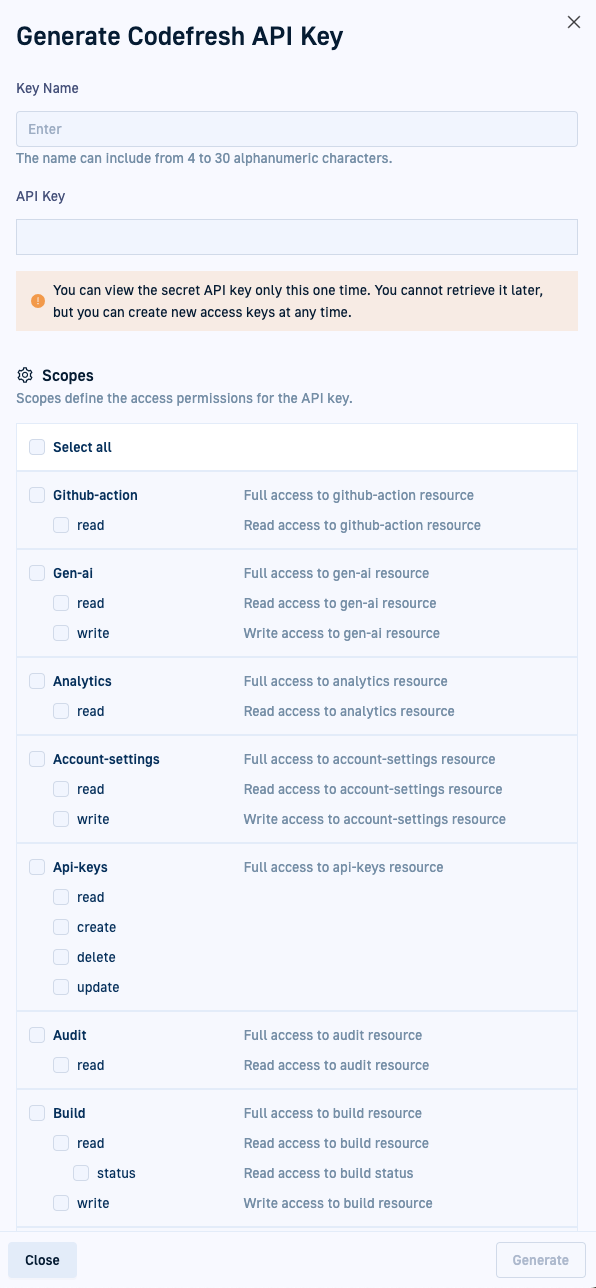 - Click Generate. Codefresh generates the key and pastes it in the API Key field.