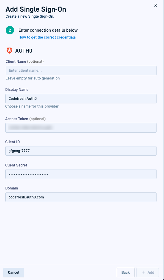 After creating an Auth0 application, create an SSO account for OAuth0 in Codefresh.