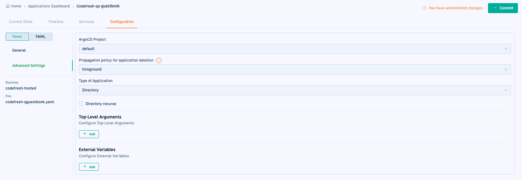 Create fully GitOps-compliant Argo CD applications directly from the GitOps Apps dashboard. When you commit the changes, Codefresh generates the application manifest and stores it in Git, ensuring a declarative, versioned, and auditable deployment process.