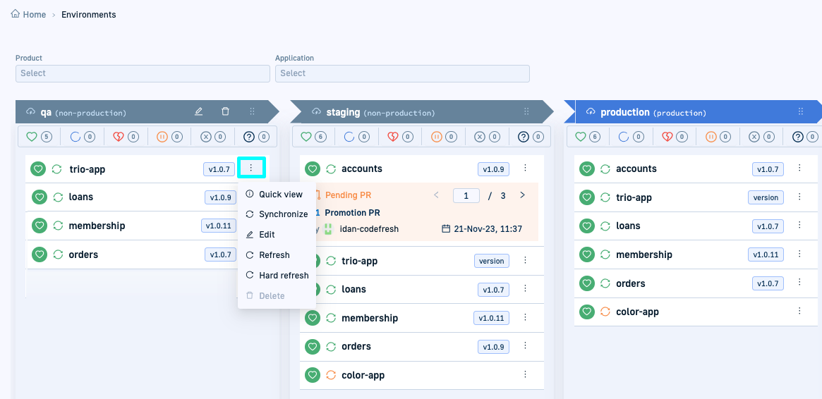 Promote a product or application from the Environments dashboard using one of two methods: