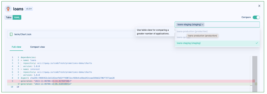 - To see the actual diffs between the applications, switch to YAML view, and then toggle between Full/Compact views.