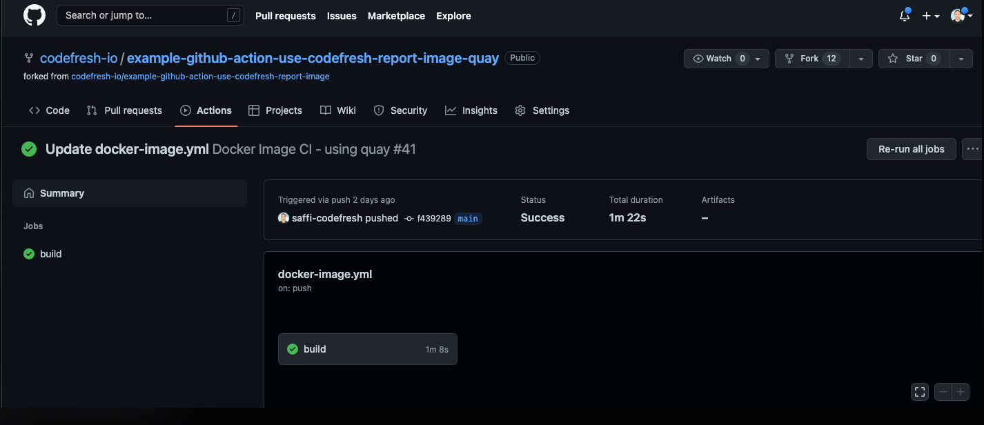 - Navigate to the build file in GitHub Actions, and view the Codefresh report image step
