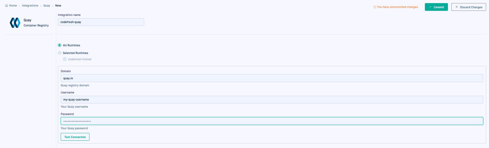 By adding a Quay integration in Codefresh, you can reference the integration account in external CI tools, such as GitHub Actions, using the integration name instead of managing explicit credentials. This simplifies security and enhances the ease of managing integrations in GitOps.