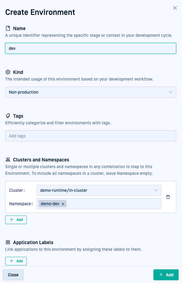 Let’s go ahead and create an environment. Setting up environments is as simple as mapping the environment to one or more clusters and namespaces.