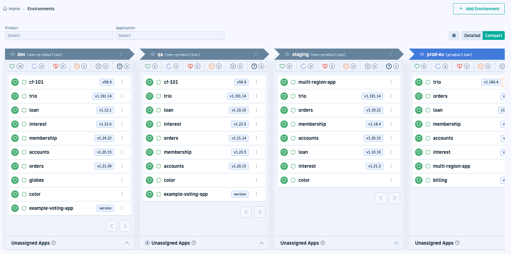 Check the Environments dashboard to see how the environments are populated with the applications you created. Here’s an example of the Environments dashboard with the three environments, and the products and their applications in the clusters and namespaces mapped to them.