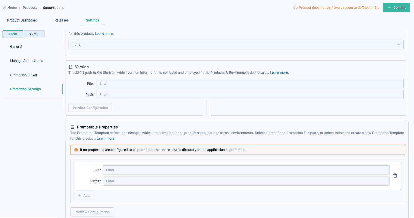 Promotion settings for a product define which changes can be promoted and under what conditions, ensuring that each promotion aligns with your deployment strategy.