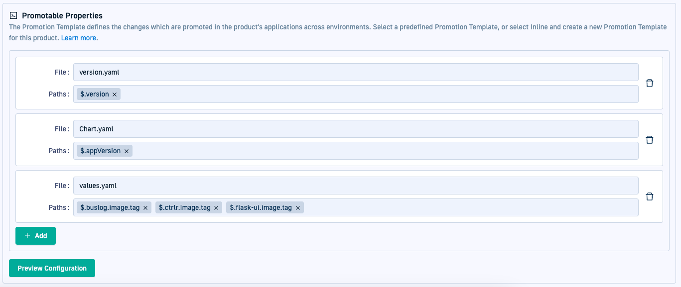 Like the Version attribute, Promotable Properties are defined through JSON path expressions. Unlike the Version attribute, you can define multiple JSON path expressions, pointing to different files or to multiple attributes within the same file.