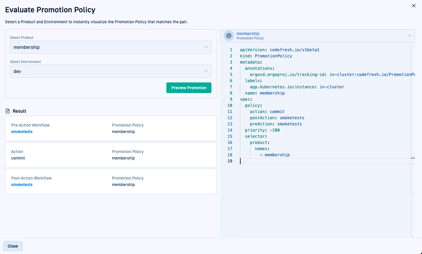 - Use the Evaluate Promotion Policy functionality to visualize policy settings for any product-environment pair. See Evaluate Promotion Settings for products and environments .