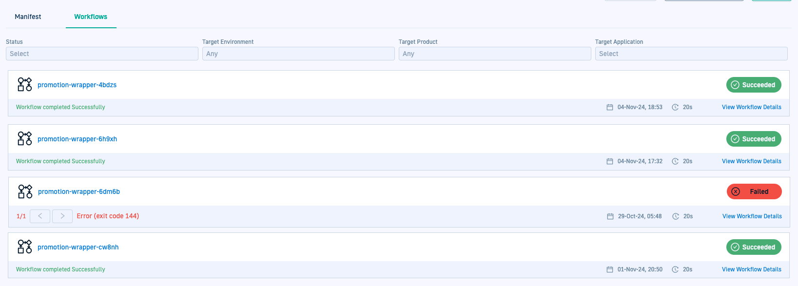 - View instances of a Promotion Workflow In addition to the status displayed on the right for each execution instance, you can filter by products, environments and applications to get to the instances of interest to you.