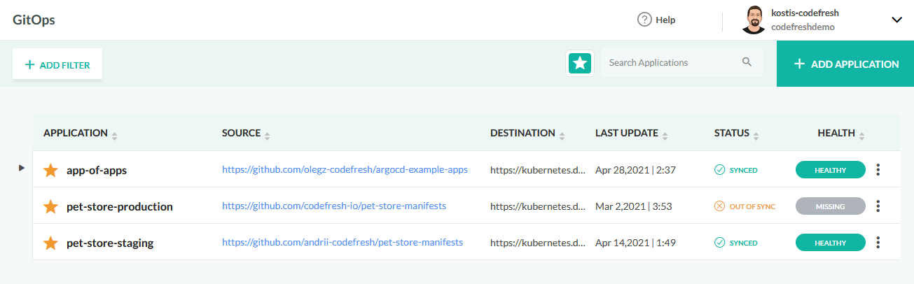 Codefresh has native support for GitOps, from creating Argo CD applications, deploying, monitoring, and managing them via the GitOps paradigm, and deployments with dedicated dashboards compai GitOps.