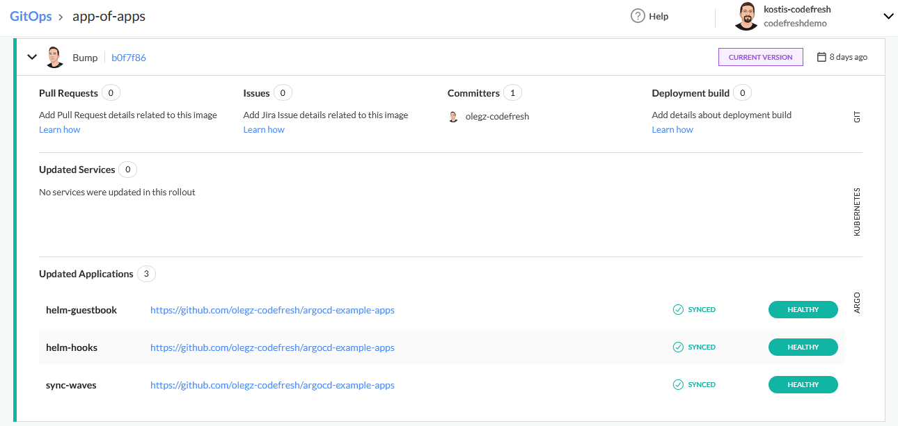 Once you deploy the application with Codefresh, the parent app is displayed in the GitOps Apps dashboard with an arrow. Clicking the arrow expand and displays the child applications.