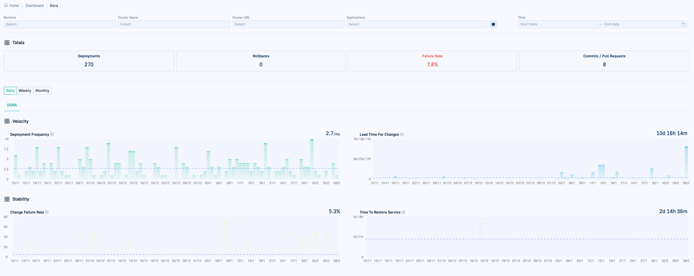 If you have several applications and deployments, the Home Dashboard and the DORA Metrics dashboards are the go-to dashboards for managers and developers alike.